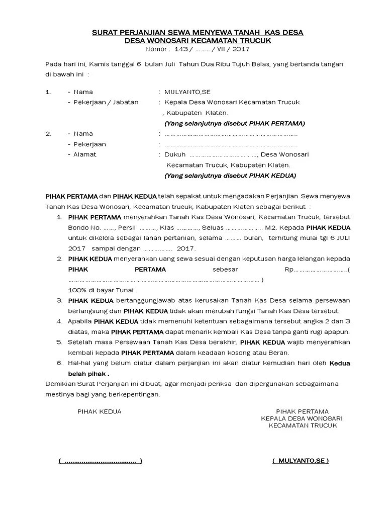 Di dalam masa berlakunya sewa/kontrak, pihak kesatu dengan alasan apapun,. Dalam sewa menyewa tanah, sangat penting bagi penyewa untuk mencatat penggunaan bahan oleh penyewa dikemudian hari. Bagi yang pertama kalinya menyewa tanah, mungkin saja anda belum familiar dengan hal ini dan tentunya anda membutuhkan informasi yang lengkap . Surat perjanjian sewa menyewa tanah pada hari ini (hari, tanggal, bulan, tahun) telah terjadi perjanjian sewa menyewa tanah antara: Sewa menyewa tanah ini dibuat untuk jangka waktu ______ tahun dan dapat diperpanjang dengan persetujuan kedua belah pihak.